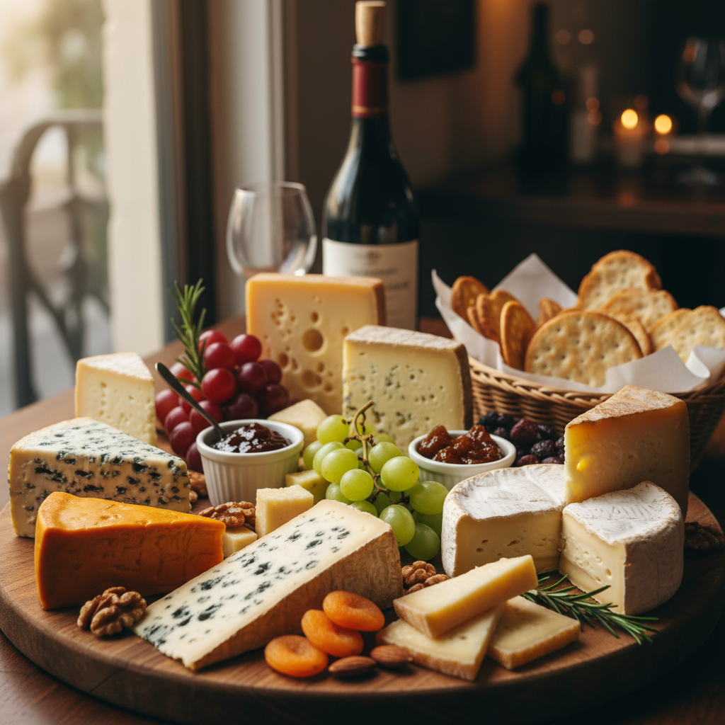 Une sélection raffinée de fromages artisanaux affinés, accompagnée de pain aux noix et de confiture de figues.